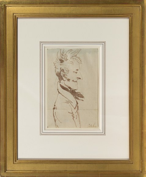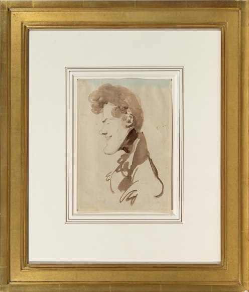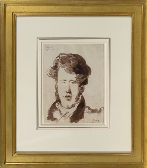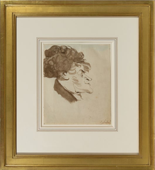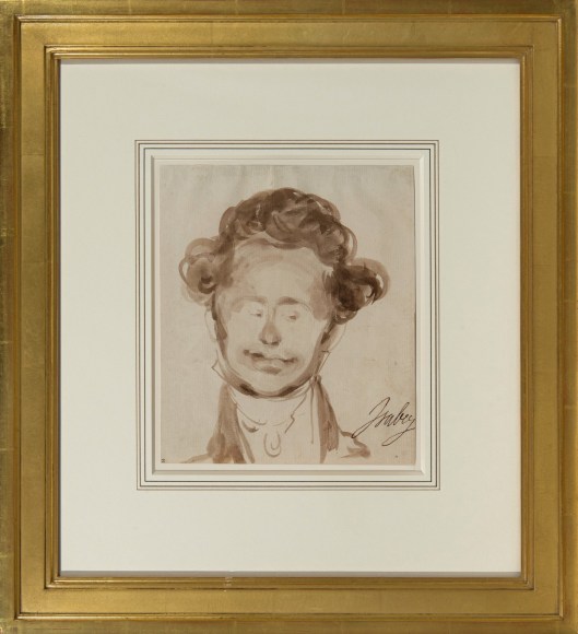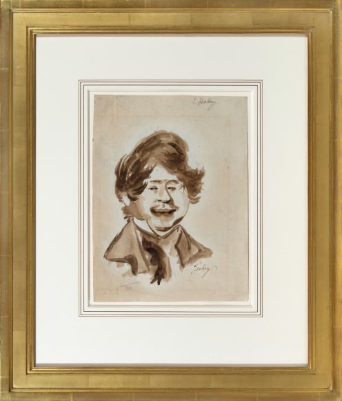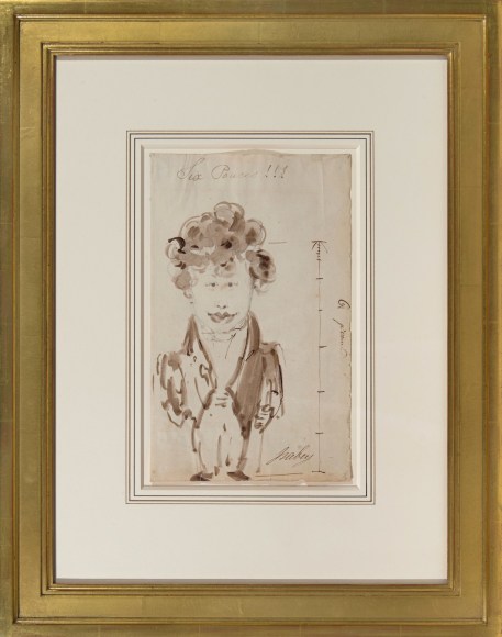 Isabey's teasing brush captured a musician in the midst of these painters, as well. The present sketch, inscribed "Mengal", most likely refers to Jean Mengal (1796-1878), who, along with his brother Martin Joseph, was a noted horn player at the Paris Opera. The subjects of the drawings inscribed "Machen" and "Six Pouces" remain unidentified, though the latter figure must have been noted for his height (or lack thereof), as pouce is an archaic French measurement roughly equivalent to an inch.