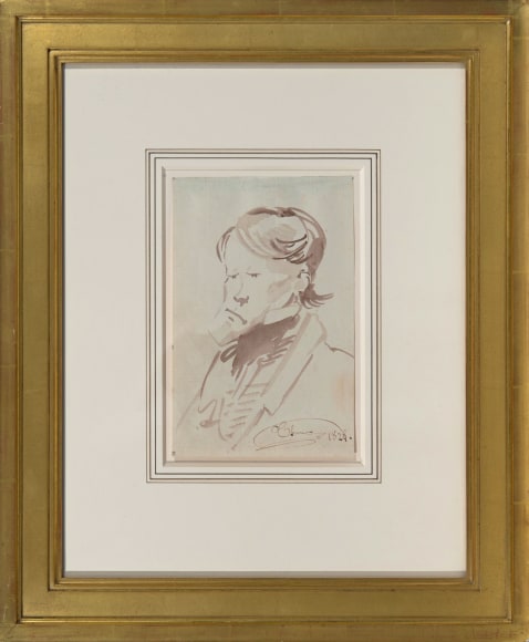 Though it is not clear whether these contemporaneous drawings were meant as a series, five of them bear the collector's stamp of the Marquis Philippe de Chennevières (1820-1899), the longtime director of the Ecole de Beaux-Arts and organizer of the Salon from 1852-1870. The Marquis has been described by Lugt as one of the most knowledgeable collectors of the nineteenth century, whose collection is currently the subject of an exhibition at the Louvre and at the Musée Jacquemart-André in 1994. That these caricatures were kept in his collection alongside polished drawings by Fragonard, Boucher, and Girodet is a testament both to their quality and to their vivid evocation of Paris in a golden age.