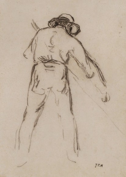 Jean-François Millet was born in 1814 in the Norman village of Gruchy, the eldest child in a large, closely knit family of farmers living in modest prosperity on their own land. His parents, religious and patriarchal, saw to it that he received a good education, which gave him a knowledge of Latin and a lifelong interest in literature. Having shown early signs of talent, the youth was sent to Cherbourg in 1833 to work with a local portrait painter, Bon Dumouchel (1807–1846). Two years later, he entered the studio of Lucien-Théophile Langlois (1803–1845), a former pupil of Antoine-Jean Gros (1771–1835). In 1837, provided with a stipend by the city of Cherbourg, Millet went to Paris, to enroll at the Ecole des Beaux-Arts as the pupil of the history painter Paul Delaroche (1797–1856), then at the height of his celebrity. After two unhappy years of study, Millet competed unsuccessfully for the Rome Prize, left his teacher, and lost his stipend. Back in Cherbourg, he set himself up as a portrait painter. One of his portraits was accepted for the Paris Salon of 1840, but another, commissioned by the city of Cherbourg, was returned to him as a poor likeness. Discouraged, Millet decided to seek better luck in Paris, where he established himself with his wife, the frail Pauline-Virginie Ono, barely twenty years old. His portraits of that time, modeled in hard contrasts of light and shadow (Portrait of Mademoiselle Ono, c.1841, Musée Thomas-Henry, Cherbourg), are indebted to the Spanish painters whose work he was able to study in the Galerie Espagnole at the Louvre. While he struggled for a livelihood, his wife contracted tuberculosis and died. Millet returned to Cherbourg in 1844 and here took as his companion a servant girl of eighteen, Catherine Lemaire. To reach a wider audience, he produced ingratiating bucolic idylls, using a technique of flecked touches of light color, his manière fleurie, a concession to a popular revival of rococo style to which his friend Narcisse Diaz de la Peña may have introduced him. Sensing the disapproval of his Cherbourg relations, he moved with his mistress to Le Havre and thence to Paris (1846), where he continued to woo the public with mildly erotic compositions. But in his drawings for them he already gave proof of greater energy and seriousness than was called for by these slight inventions (The Lovers, c. 1848, The Art Institute of Chicago).