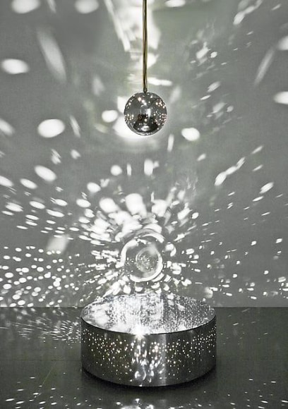 Highlights of Moeller Fine Art's exhibition include Otto Piene’s Licht Ballett (1969), a chrome round table and hanging globe containing revolving lamps that project light on the walls, ceiling and floor; Heinz Mack’s Veil of Light (1964), a large sheet of aluminum hex cells that reflect light; and Billy Apple’s Unidentified Fluorescent Object [UFO] (1967), a neon light sculpture.