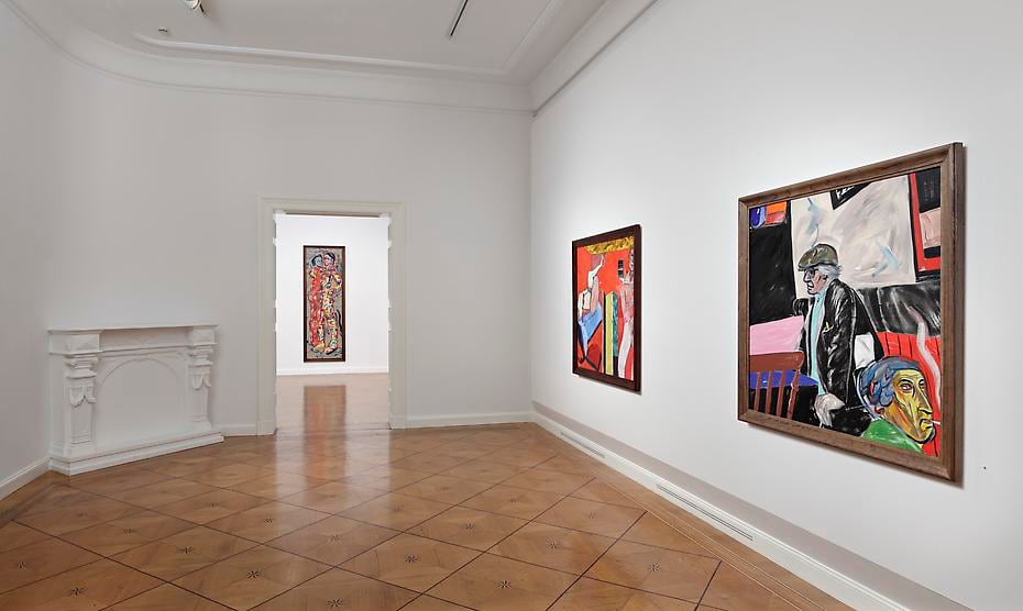 For Kitaj, art was a medium of intellectual exploration, which he mined using references from history, art, literature, pop culture, and his own life. These complex compositions of disorienting landscapes and impossible three dimensional constructions are built up using a montage of images, which he called 'agitational usage'. This juxtaposition is not only one of space but also of time; The Room (Rue St. Denis), 1982-83, exhibited at the Tate retrospective in 1994 and included in the gallery’s exhibition, refers to Kitaj's life and its connection to that of Pablo Picasso: "the year that I lived in Paris, I painted this room which is in the mile-long street which I have haunted since I was eighteen, a street Picasso also loved but I don't know if he ever painted it or its small rooms."