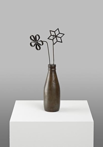 Barker’s work is something of a paradox in that it questions (and at times also mocks) many of the principles of traditional, modernist art, while also instilling itself with obvious references to a great variety of art from all periods. With “Venus Escargot”, 1987, Barker playfully alludes to the classical tradition of sculpture by casting in patinated bronze the head of the Venus de Milo and covering her eyes with snails. In contrast is Barker’s Kitsch arrangement “Victorian Fruit”, 1969, composed of a bowl filled with a multitude of fruits gleaming in chrome and encased in an antique glass cover. The techniques and materials he employs, the almost heroic elevation of the commonplace, the humorous overtones and the acceptance of the banal and the kitsch all contribute to the provocative originality of Barker’s work. His aesthetic is not rooted in theory or art history, but in personal experience and a subtly developed response to celebrated images.