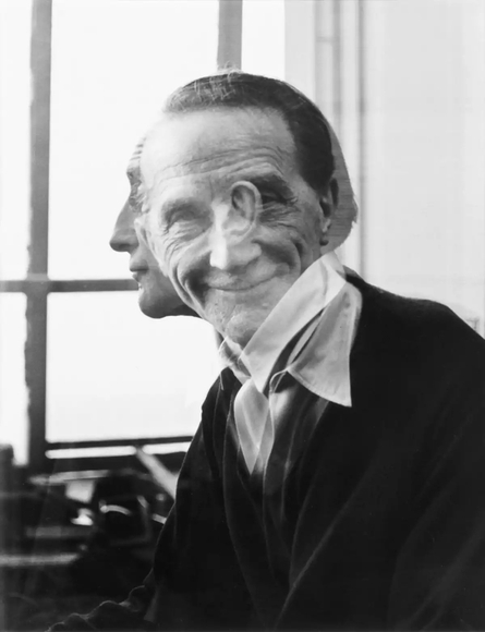 In March 1953 Michael Freilich, owner of the Roko Gallery in Greenwich Village, asked twenty-eight year-old Victor Obsatz (1925—2019) to photograph Marcel Duchamp in his apartment at 210 West 14th Street. A double exposure occurred by chance, creating an overlay of Duchamp’s playful smile and iconic profile. The resulting image pleased Duchamp very much, as he chose it for both the front and back cover of Robert Lebel’s 1959 catalogue raisonné.